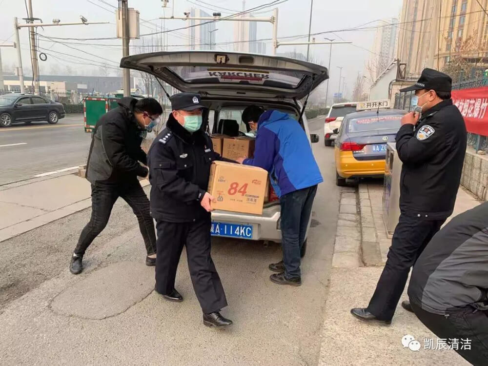石家庄凯辰清洁用品有限公司到建通派出所慰问了奋战在防控一线的公安民警。对公安机关不畏艰苦、全员坚守、始终战斗在一线,为人民群众保驾护航的艰苦工作表达了深深谢意,并向派出所赠送了30桶“84”消毒液和1个压缩喷雾器。以尽我们经营企业的微薄之力,和应尽的社会责任。