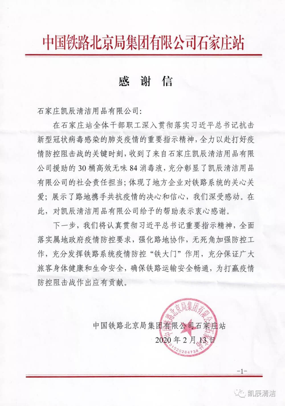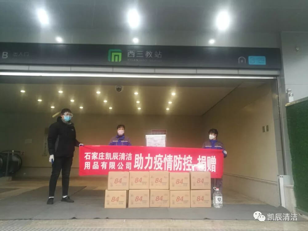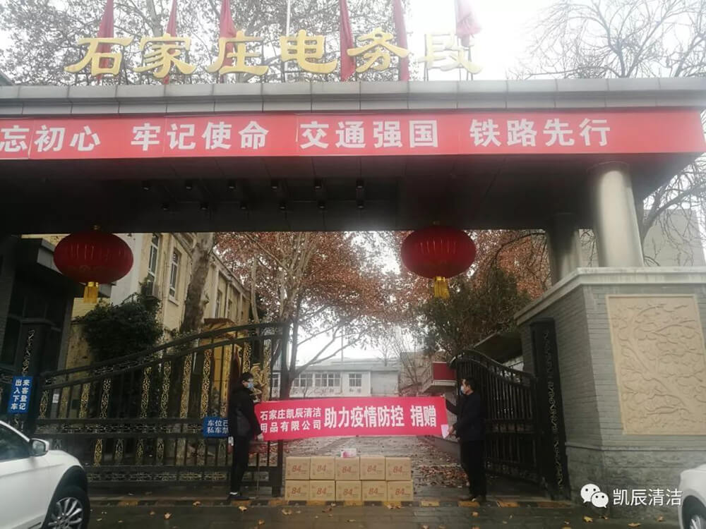 石家庄凯辰清洁用品有限公司,助力石家庄轨道交通防疫工作。分别向石家庄火车站、石家庄电务段、石家庄地铁,捐赠了84消毒剂,一次性橡胶手套等防疫物资。为共同战“疫”出力!