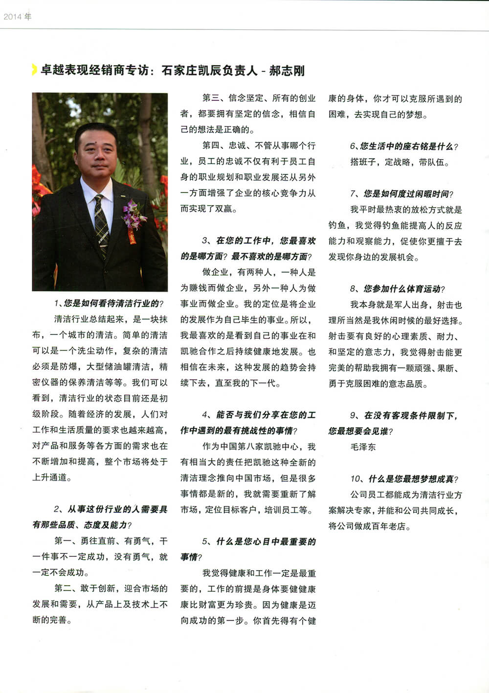 2014年卓越表现经销商,石家庄凯辰清洁用品有限公司总经理郝志刚先生,接受专访,成为凯驰中国新闻简报2014封底人物。
